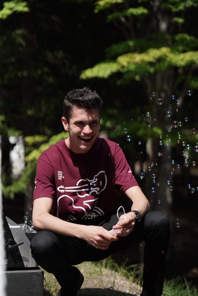 He is a prize-winner of numerous national and international solo and chamber music competitions. He has played several concerts with the Amadinda Percussion Group and has participated in music festivals, like the Pacific Music Festival 2022, the PAAX GNP Music Festival 2024, and the Schleswig-Holstein Music Festival 2025. During the 2024/2025 season, he was an academist with the Lucerne Symphony Orchestra.